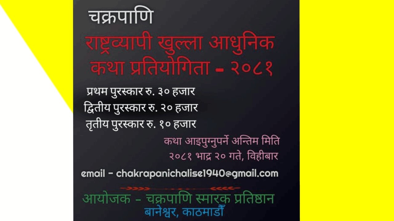 चक्रपाणि स्मारक प्रतिष्ठानले “राष्ट्रब्यापि कथा प्रतियोगिता-२०८१” गर्ने भएको छ । नेपाली भाषामा लेखिएको मौलिक वा अन्य भाषामा लेखिएको भए अप्रकाशित मौलिक १५०० देखि ५००० शब्दको कथालाई प्रतियोगितामा सामेल गराईने तथा प्रथम हुनेलाई ३० हजार, दोश्रो हुनेलाई २० हजार तथा तेश्रो हुनेलाई १० हजार नगद पुरस्कार दिइने पनि जनाइएको छ ।