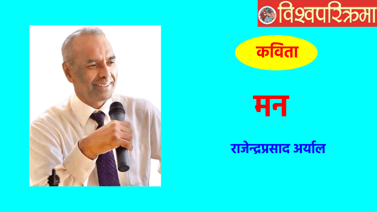 कवि परिचयः राजेन्द्रप्रसाद अर्याल गोरखा नेपालमा जन्मेका हुन् र हाल म्याडिसन, अमेरिकामा बसोवास गर्छन् । उनी नियात्रा, कविता, कथा, निबन्ध, गीत, गजल आदि विधाम कलम चलाउन रुचाउँछन् । उनका फ्रान्सको भ्रमण मेरो संस्मरण, (नियात्रा, २०६२) माल्भा (नियात्रा, २०७३) तथा आजको मान्छे (कविता संग्रह, २०७८) कृतिहरु प्रकाशित छन् ।