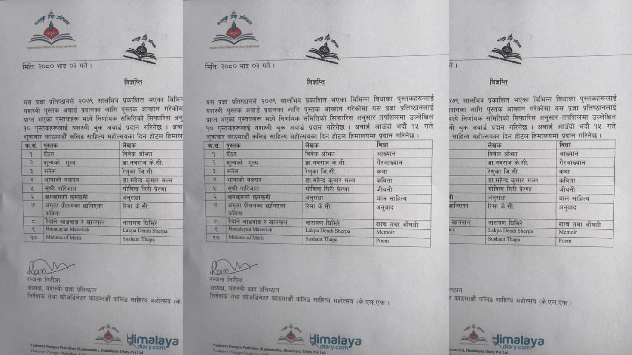 यश्वस्वी प्रज्ञा प्रतिष्ठानले विसं २०७९ सालमा प्रकाशित विभिन्न बिधाका १० पुस्तकलाई “यश्वस्वी पुस्तक अवार्ड” प्रदान गर्ने निर्णय गरेको कुरा प्रतिष्ठानका अध्यक्ष रञ्जना निरौला हस्ताक्षरित बिज्ञप्तिमा जनाइएको छ ।