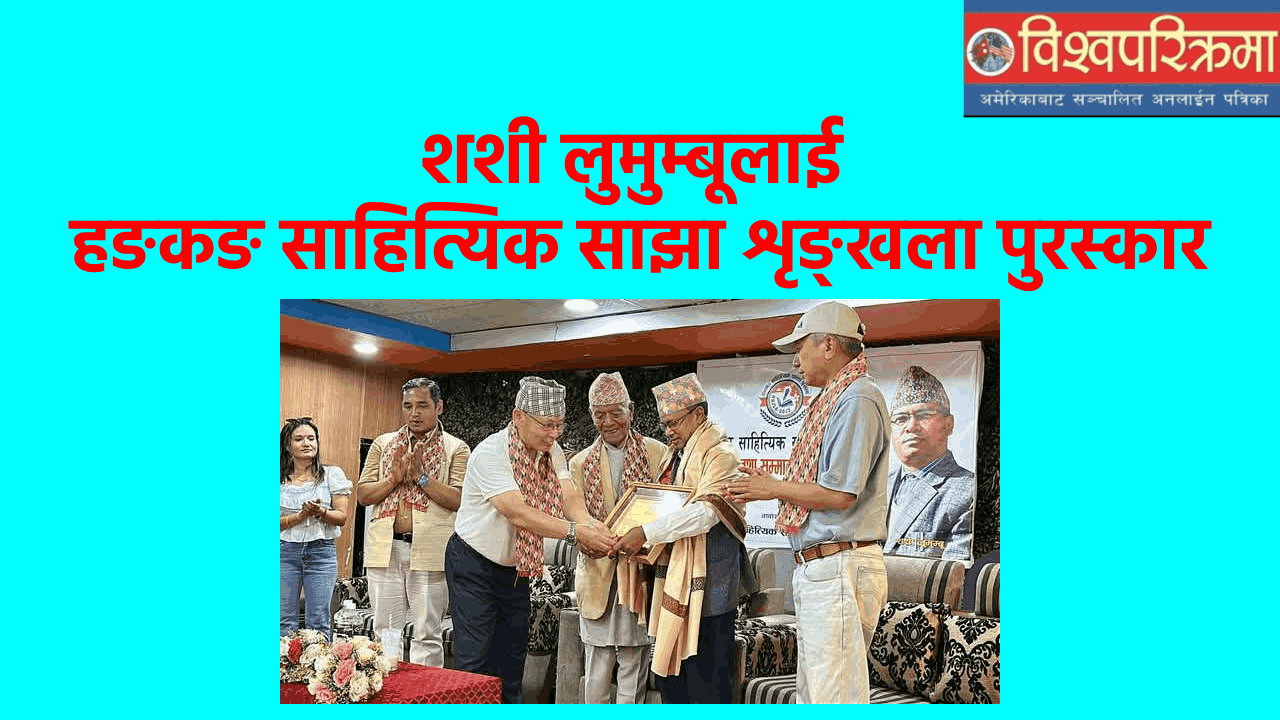साहित्यकार शशी लुमुम्बू ‘हङकङ साहित्यिक साझा शृङ्खला पुरस्कार द्वारा पुरस्कृत एवम् सम्मानित भएका छन् । शृङ्खलाद्वारा शनिबार राजधानीमा आयोजित समारोहमा उनलाई नेपाल प्रज्ञा–प्रतिष्ठानका पूर्वकुलपति, कविवर तथा मुन्धुमविद् बैरागी काइँलाले दोसल्ला तथा सम्मानपत्र अर्पण गरी नगद पचपन्न हजार पाँच सय पाँच रुपैयाँ हस्तान्तरण गरे।