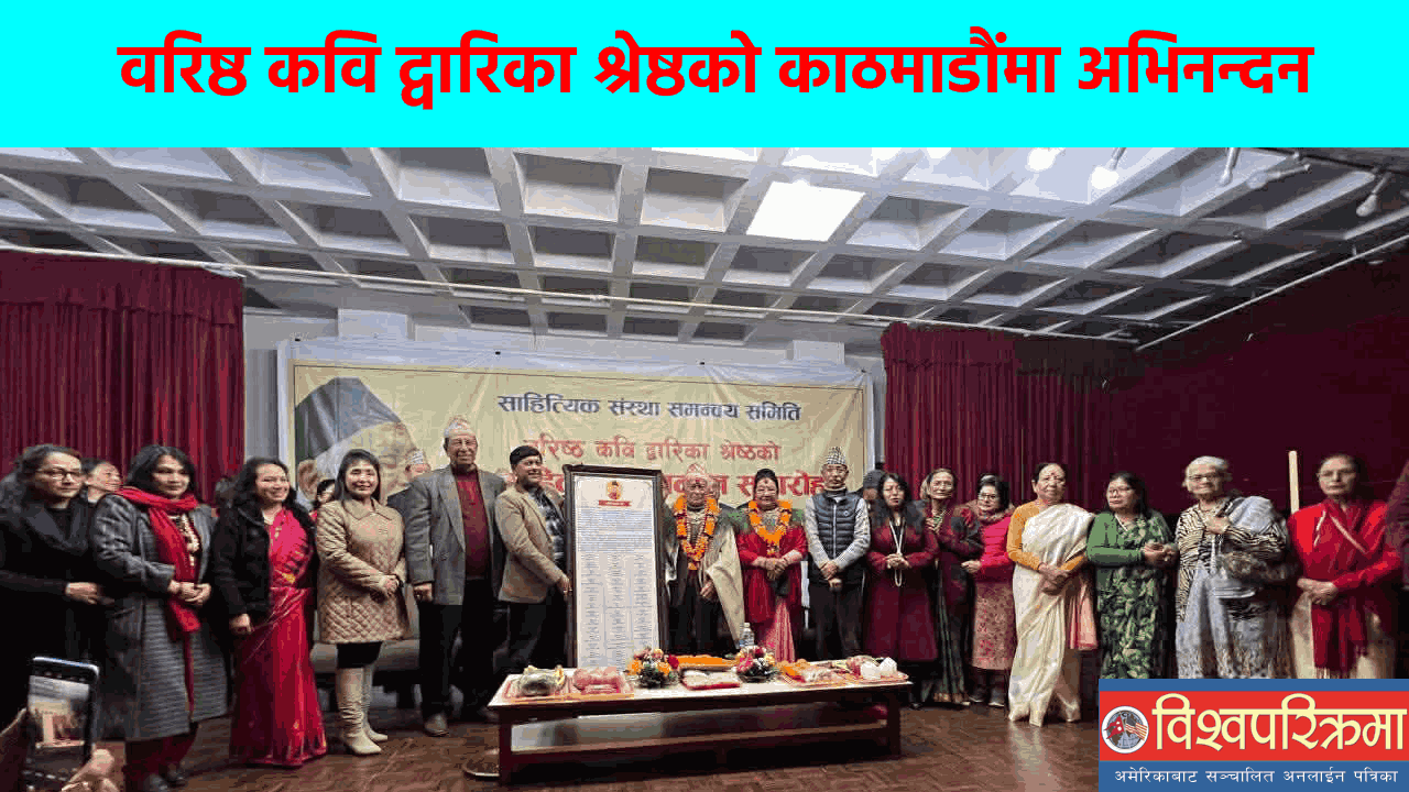 नेपाली भाषा, साहित्य, कला, संस्कृति र साहित्यिक पत्रकारितामा योगदान गर्दै आएका एकाउन्न संस्थाको साझा मञ्च “साहित्यिक संस्था समन्वय समिति”ले आज नेपाल पर्यटन बोर्ड, भृकुटीमण्डप, काठमाडौंमा ९१ वर्षीय वरिष्ठ कवि द्वारिका श्रेष्ठको सामूहिक अभिनन्दन गरिएको छ ।